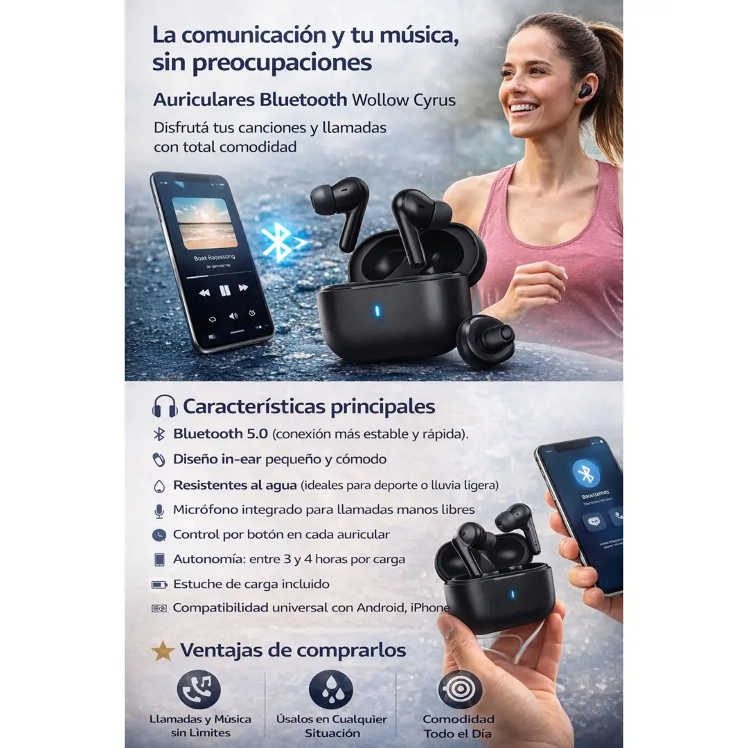 El Auricular Bluetooth Wollow Cyrus es ideal para disfrutar música y llamadas con total comodidad.