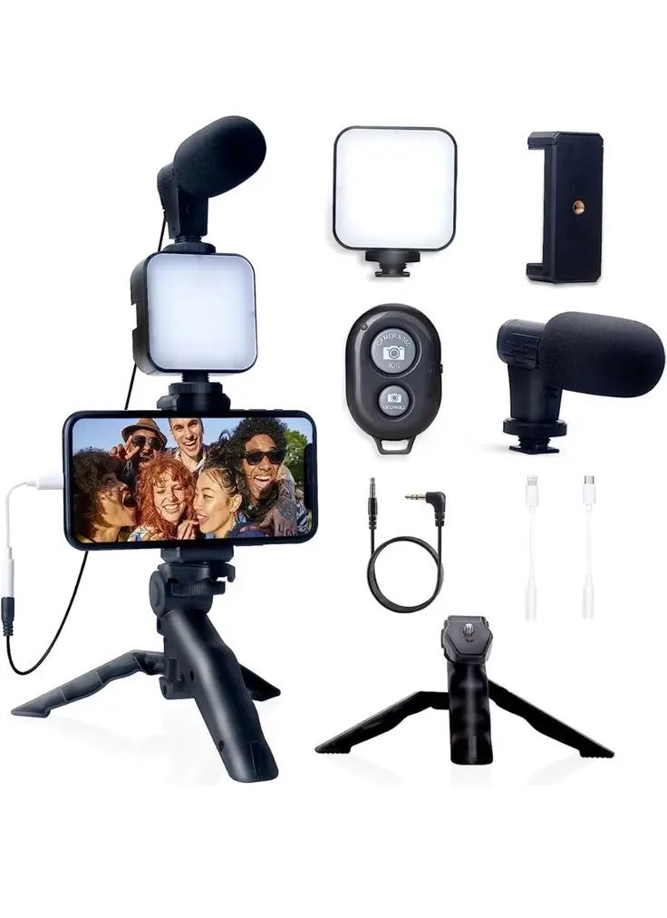 Tu estudio de grabación portátil. Un set completo que incluye trípode, iluminación LED, ajustable y micrófono de alta fidelidad, diseñado para creadores de contenido que buscan calidad profesional en sus videos y transmisiones